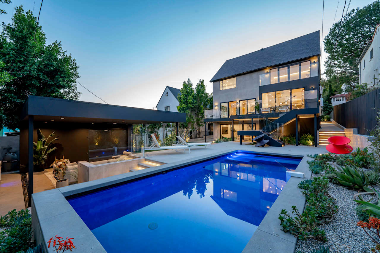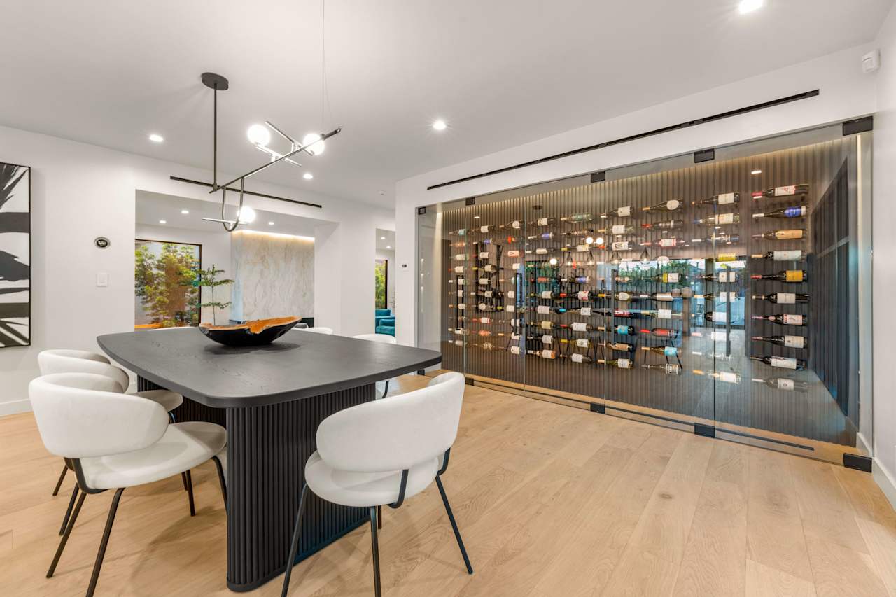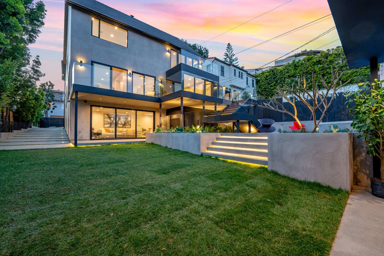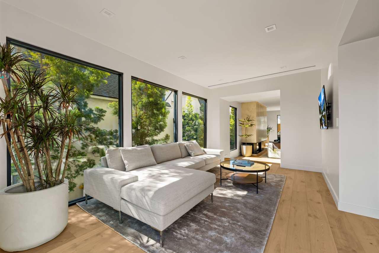 Nestled on a tranquil street just north of Hollywood Boulevard, this stunning modern home is truly an architectural masterpiece. Built by the esteemed Maison by PGB, every inch of this home has been meticulously designed with the utmost attention to detail. As you step inside, you'll be immediately greeted by the warmth of oak floors and floor-to-ceiling windows that allow natural light to fill the open floor plan. The step-down living room centers around a Montigo fireplace dressed in Calcatta Caldia stone, creating the perfect ambiance for cozy nights at home. The chef's kitchen boasts custom cabinetry, an expansive double marble island, and top-of-the-line Wolf and Thermador appliances, perfect for preparing gourmet meals to be enjoyed in the adjoining dining room with a climate- controlled 90-bottle wine cellar.