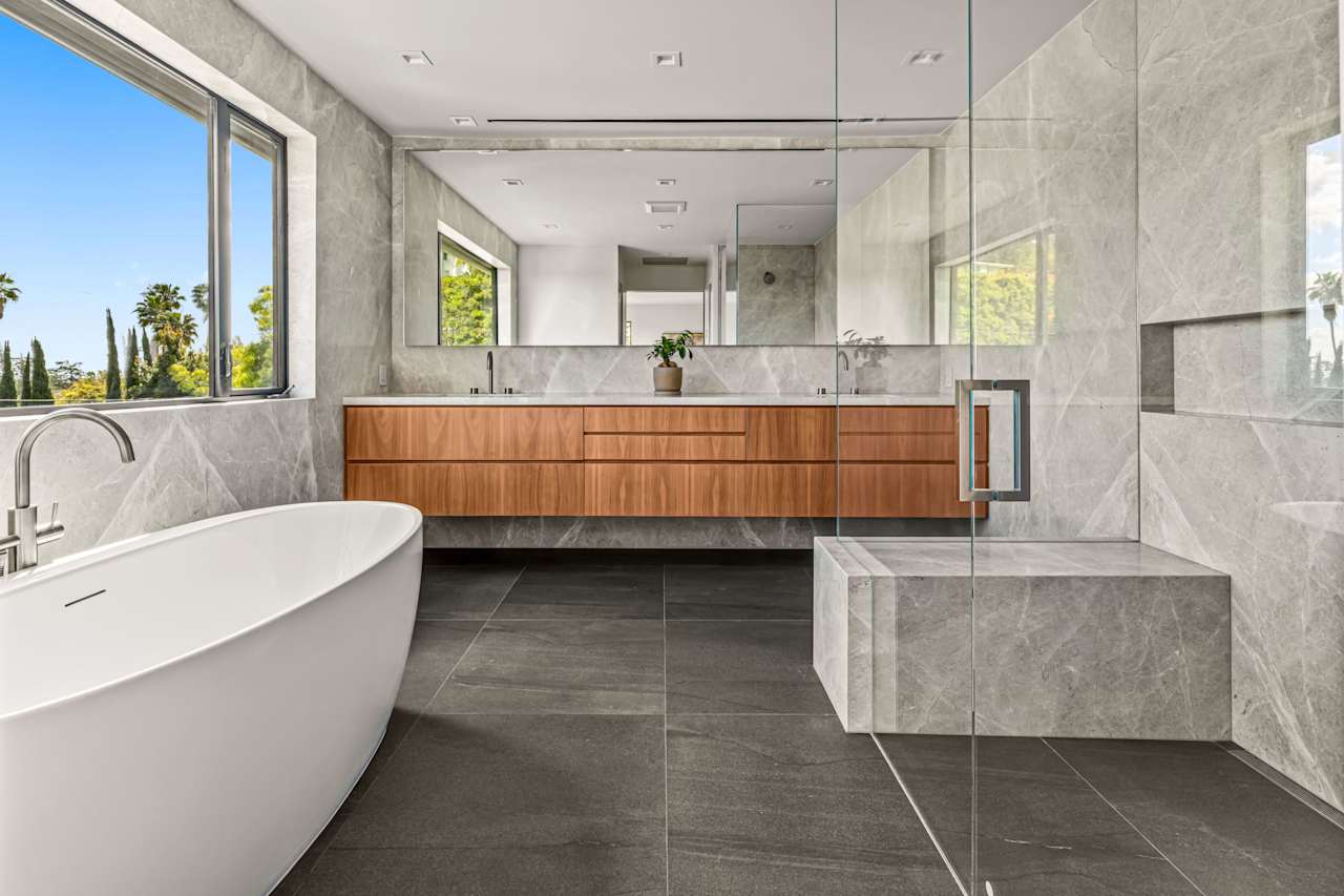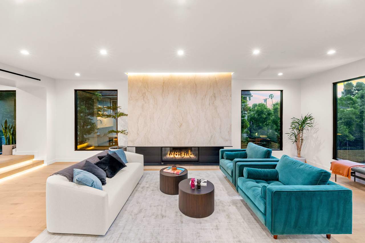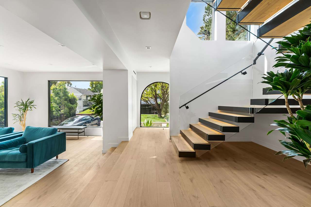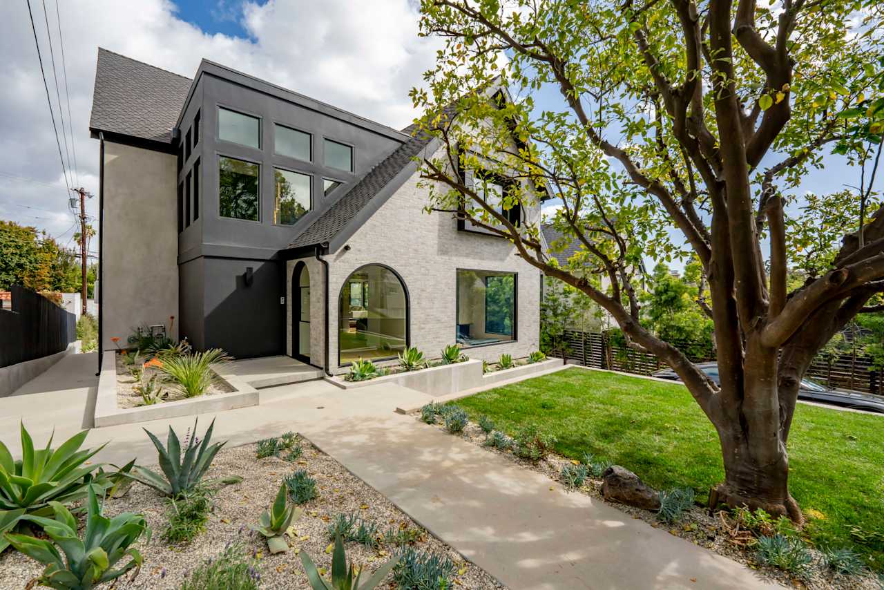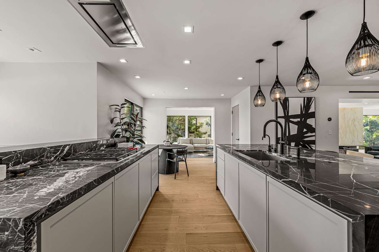 Nestled on a tranquil street just north of Hollywood Boulevard, this stunning modern home is truly an architectural masterpiece. Built by the esteemed Maison by PGB, every inch of this home has been meticulously designed with the utmost attention to detail. As you step inside, you'll be immediately greeted by the warmth of oak floors and floor-to-ceiling windows that allow natural light to fill the open floor plan. The step-down living room centers around a Montigo fireplace dressed in Calcatta Caldia stone, creating the perfect ambiance for cozy nights at home. The chef's kitchen boasts custom cabinetry, an expansive double marble island, and top-of-the-line Wolf and Thermador appliances, perfect for preparing gourmet meals to be enjoyed in the adjoining dining room with a climate- controlled 90-bottle wine cellar.