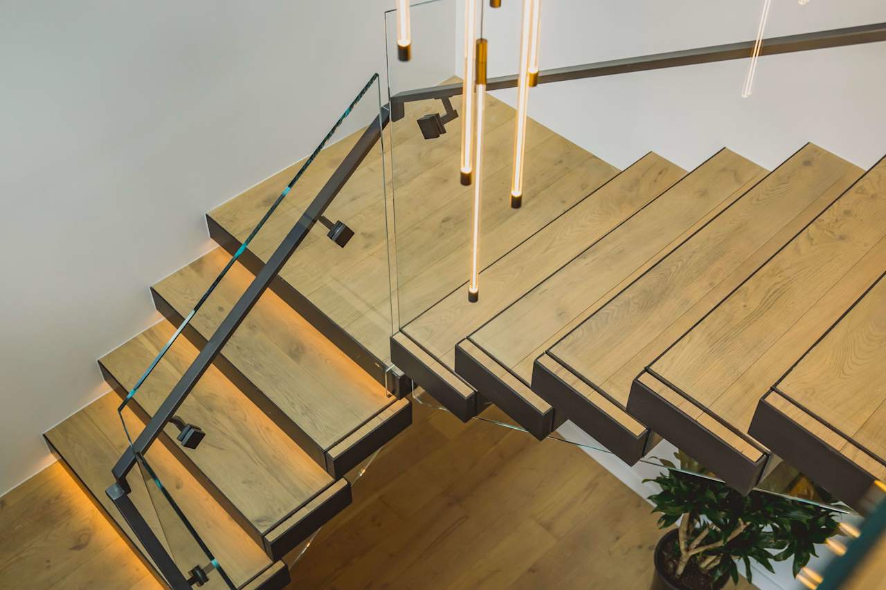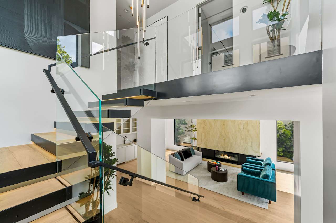 As you ascend the floating stairs to the upper level, you'll discover the luxurious primary suite featuring a primary bath adorned with natural stone throughout, custom-built walk-in closets, and two additional ensuite guest bedrooms. The ultimate in versatile living can be found in the lower guest suite unit, which is sure to impress. This gorgeous space features floor-to-ceiling sliding glass doors that open to the grassy backyard, a living room, a bedroom/office, and a full bathroom.