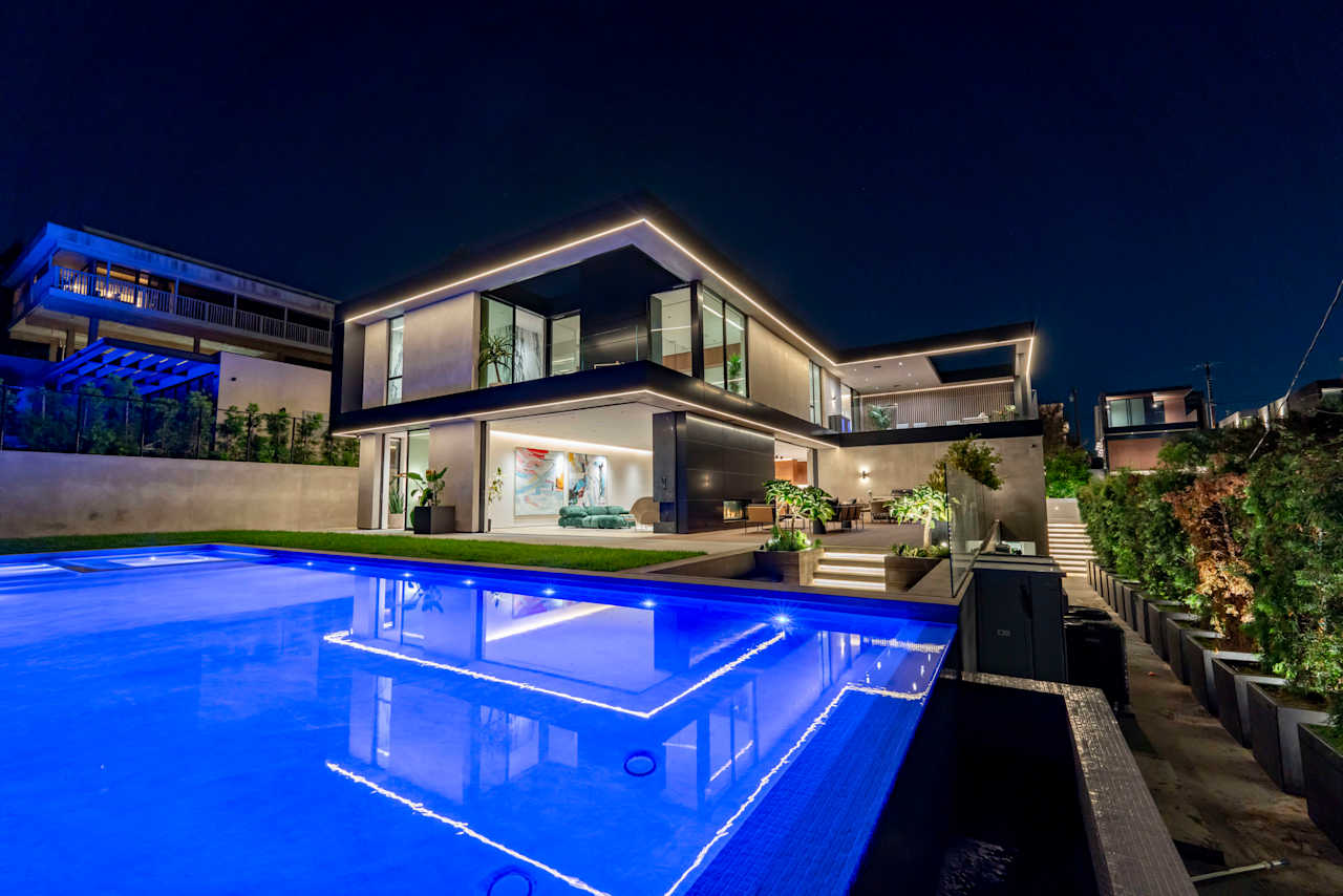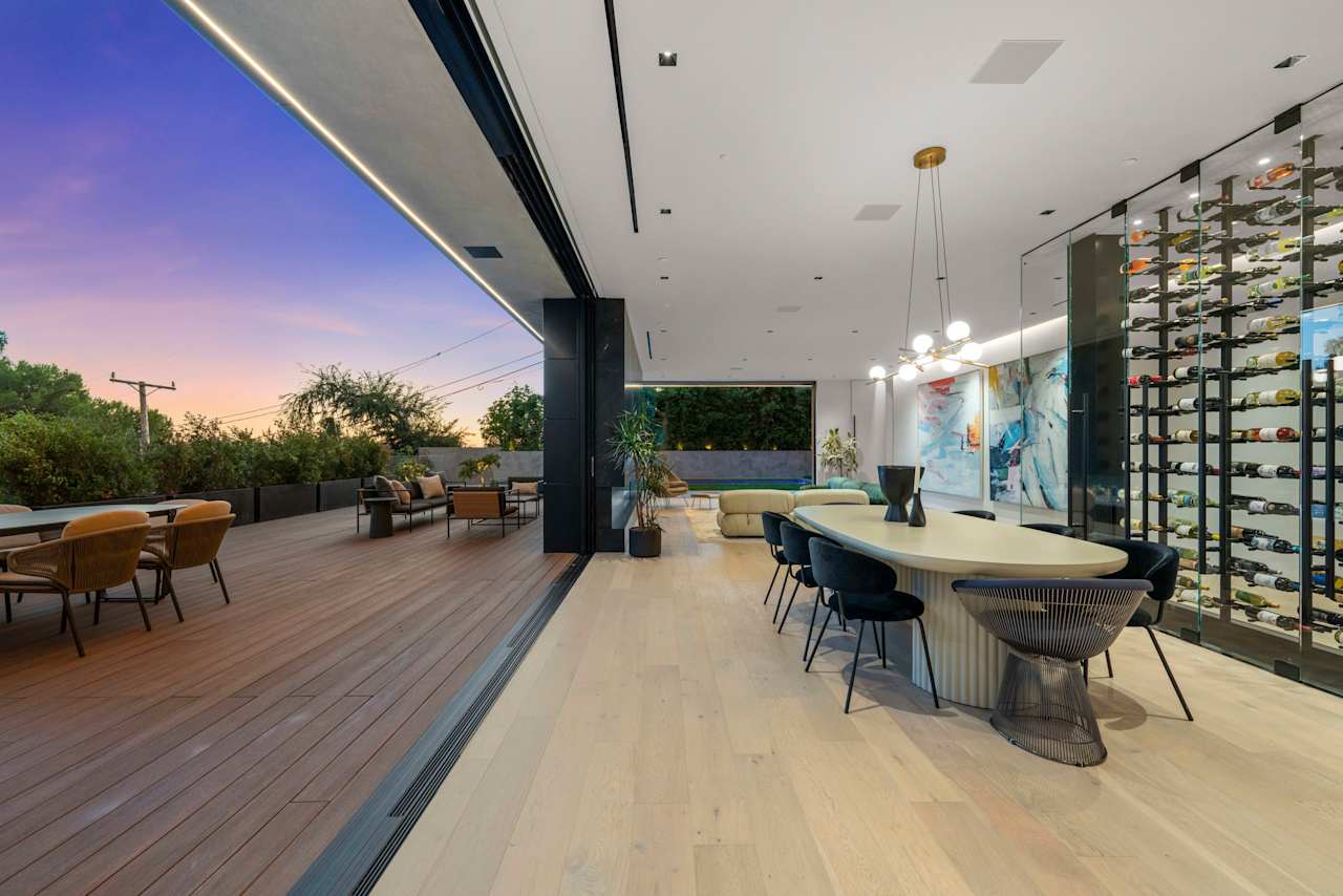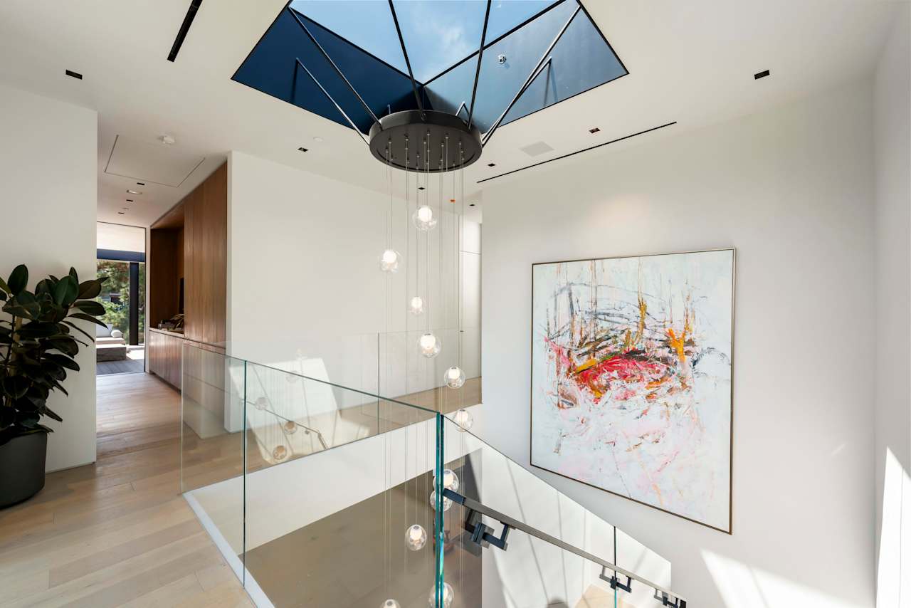 This mid-century modern inspired masterpiece also incorporates state-of-the-art sustainable features, demonstrating a commitment to eco-friendly living. The design prioritizes natural light, evident through Fleetwood floor-to-ceiling windows and doors that bring the outside in, blurring the boundary between interior and exterior spaces. Lightwells with lush gardens add a touch of nature to the lower level, while massive energy efficient skylights throughout the second floor illuminate the interiors with a warm glow. The master bedroom and entertaining deck are complemented by indoor / outdoor fireplaces, creating a cozy and inviting ambiance. The full outdoor kitchen with BBQ, sunken fire pit, and 50-foot saltwater pool offers fantastic outdoor entertainment opportunities and completes this breathtaking and eco-conscious haven.