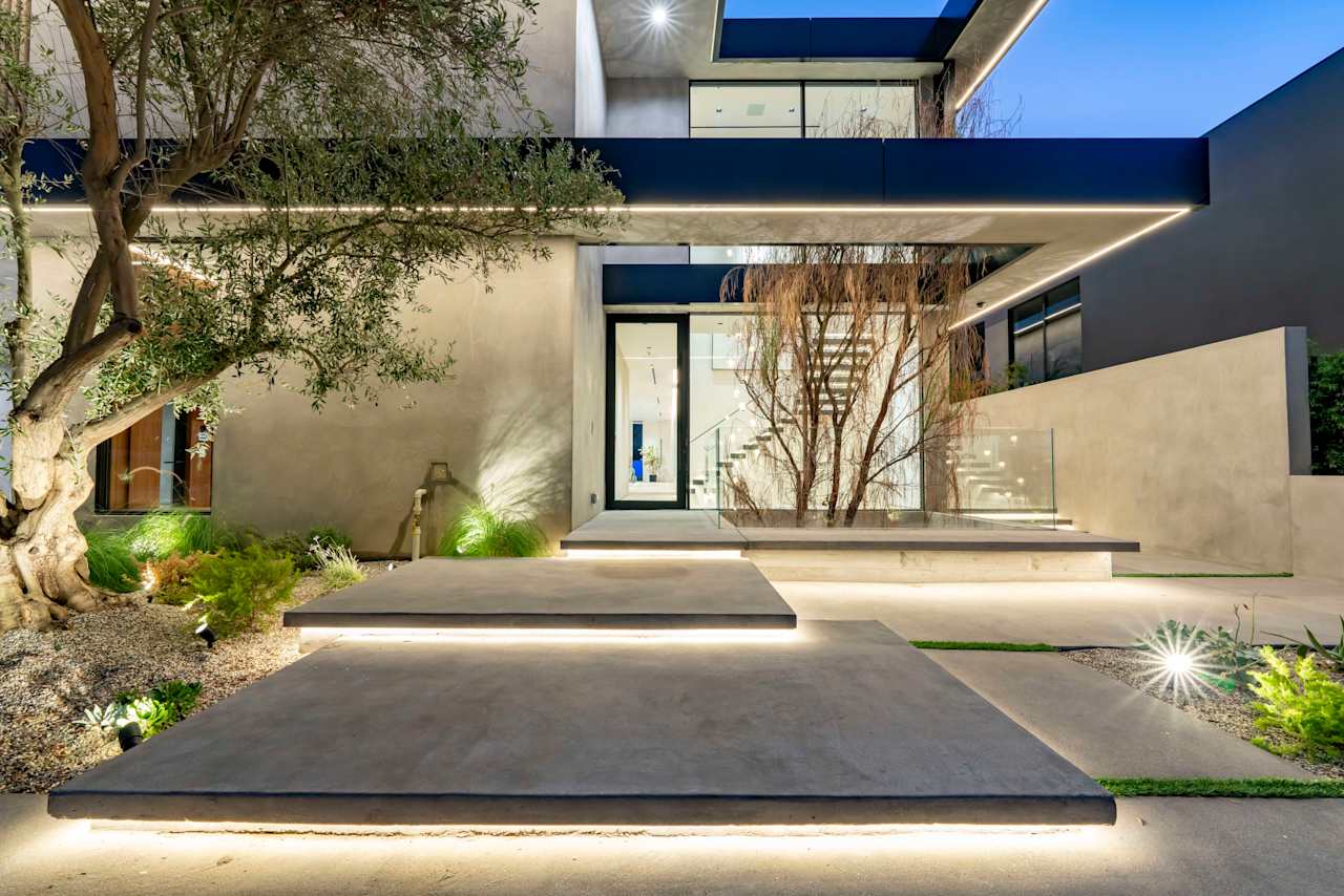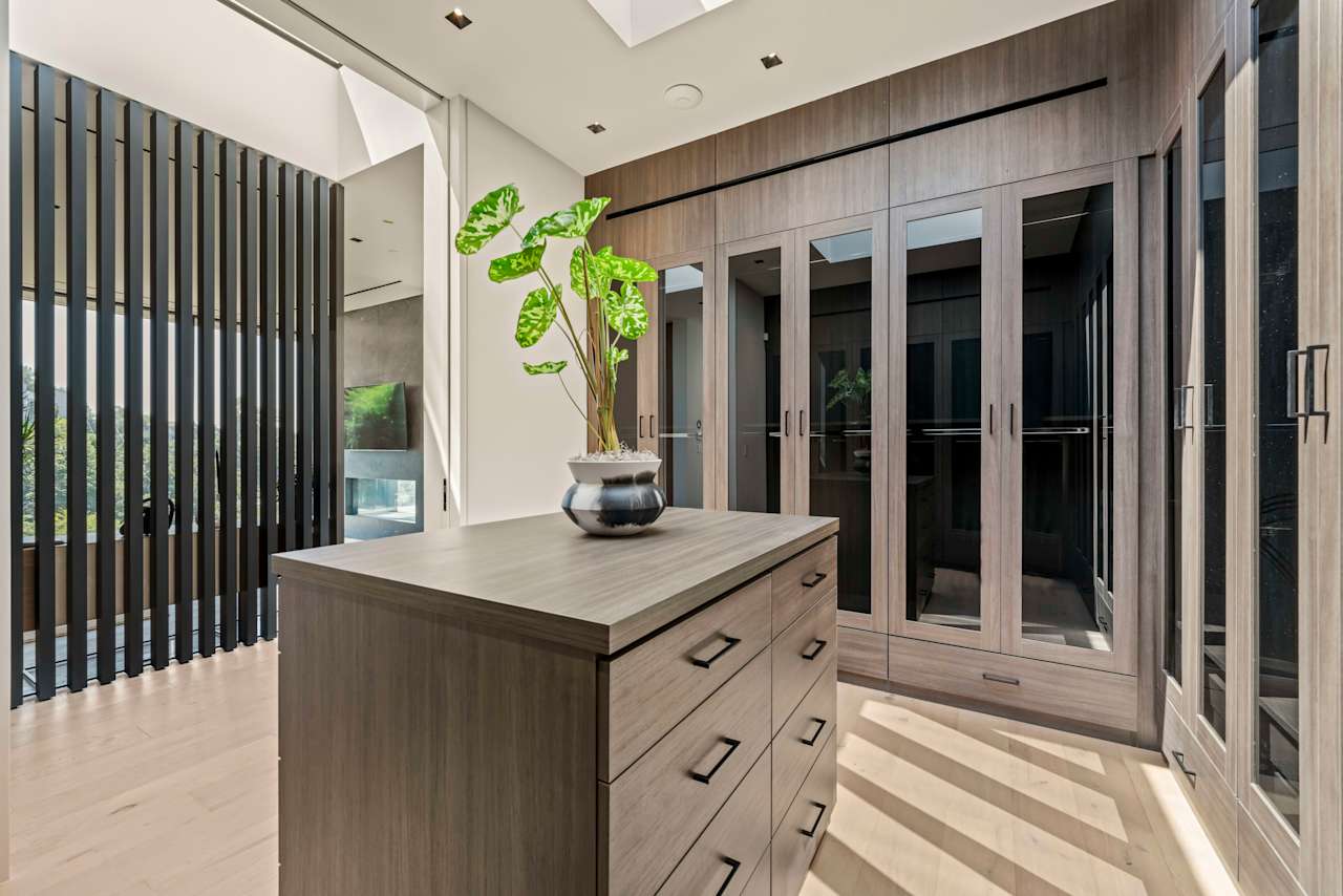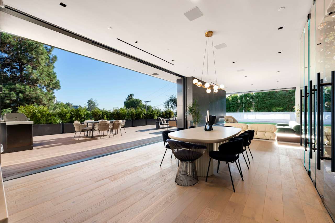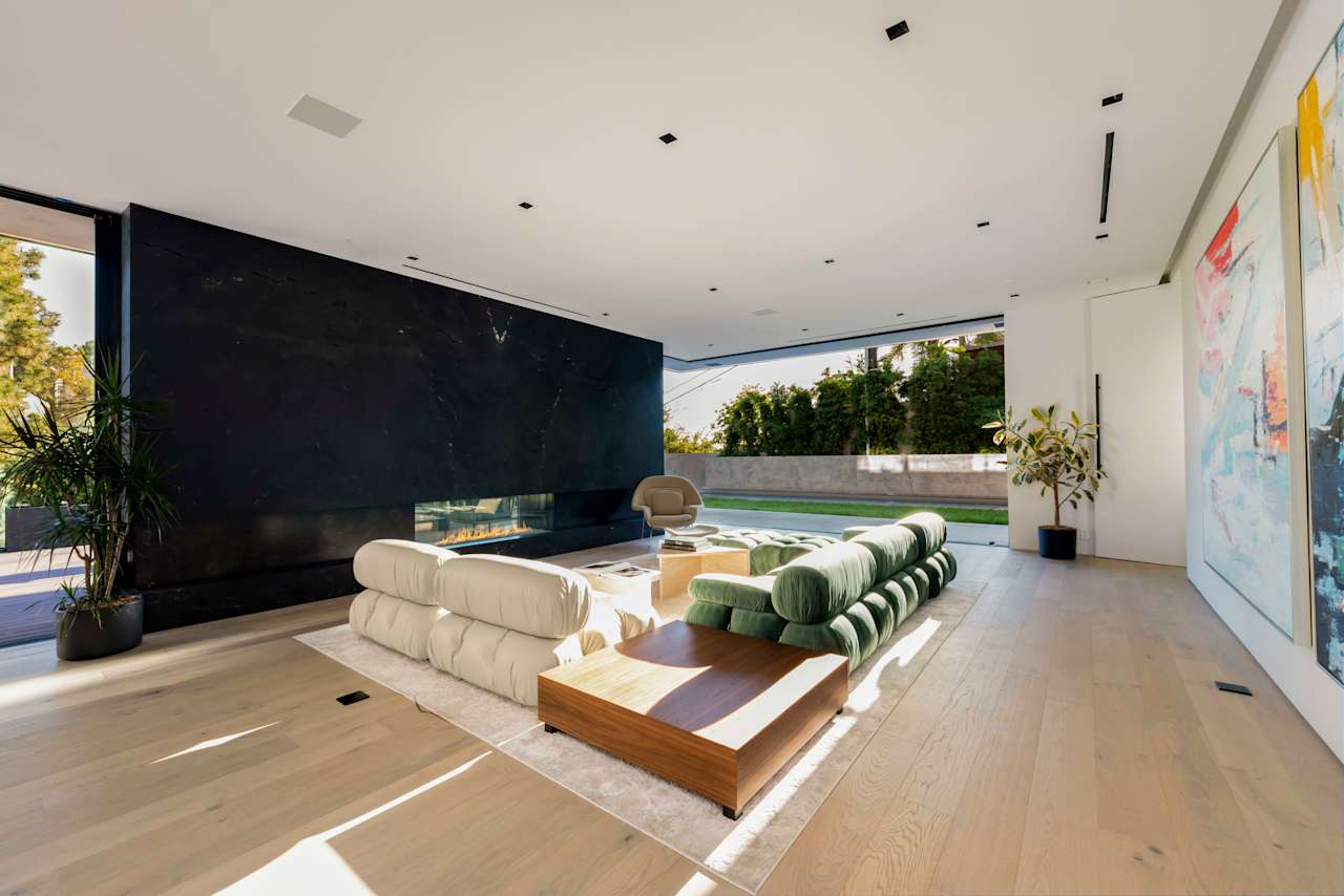 This mid-century modern inspired masterpiece also incorporates state-of-the-art sustainable features, demonstrating a commitment to eco-friendly living. The design prioritizes natural light, evident through Fleetwood floor-to-ceiling windows and doors that bring the outside in, blurring the boundary between interior and exterior spaces. Lightwells with lush gardens add a touch of nature to the lower level, while massive energy efficient skylights throughout the second floor illuminate the interiors with a warm glow. The master bedroom and entertaining deck are complemented by indoor / outdoor fireplaces, creating a cozy and inviting ambiance. The full outdoor kitchen with BBQ, sunken fire pit, and 50-foot saltwater pool offers fantastic outdoor entertainment opportunities and completes this breathtaking and eco-conscious haven.