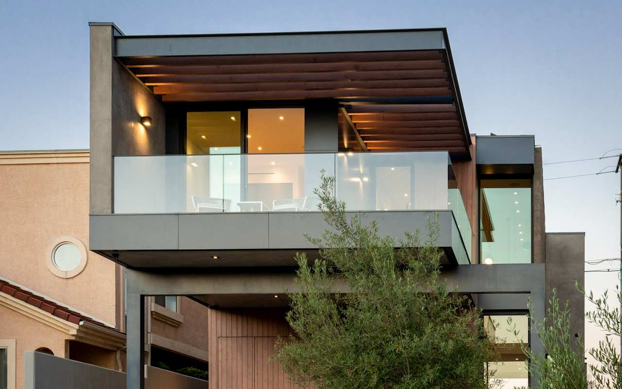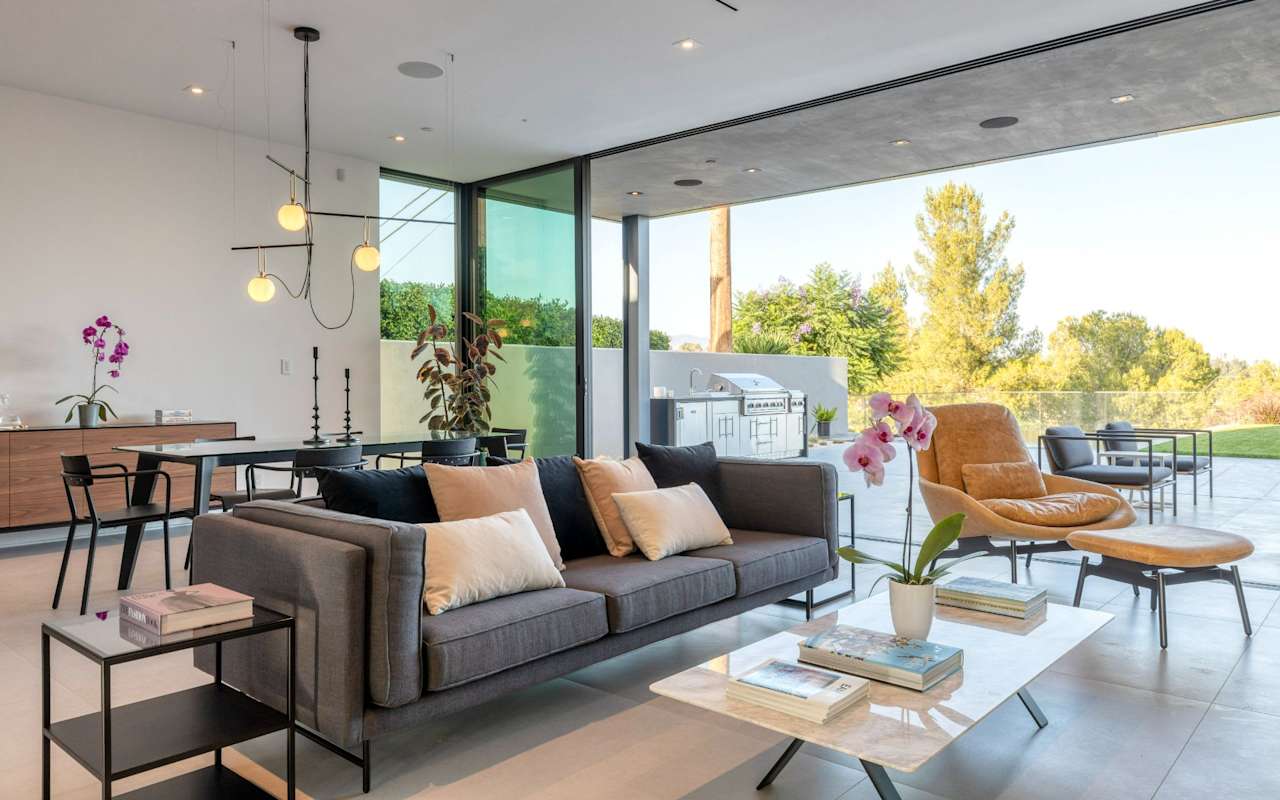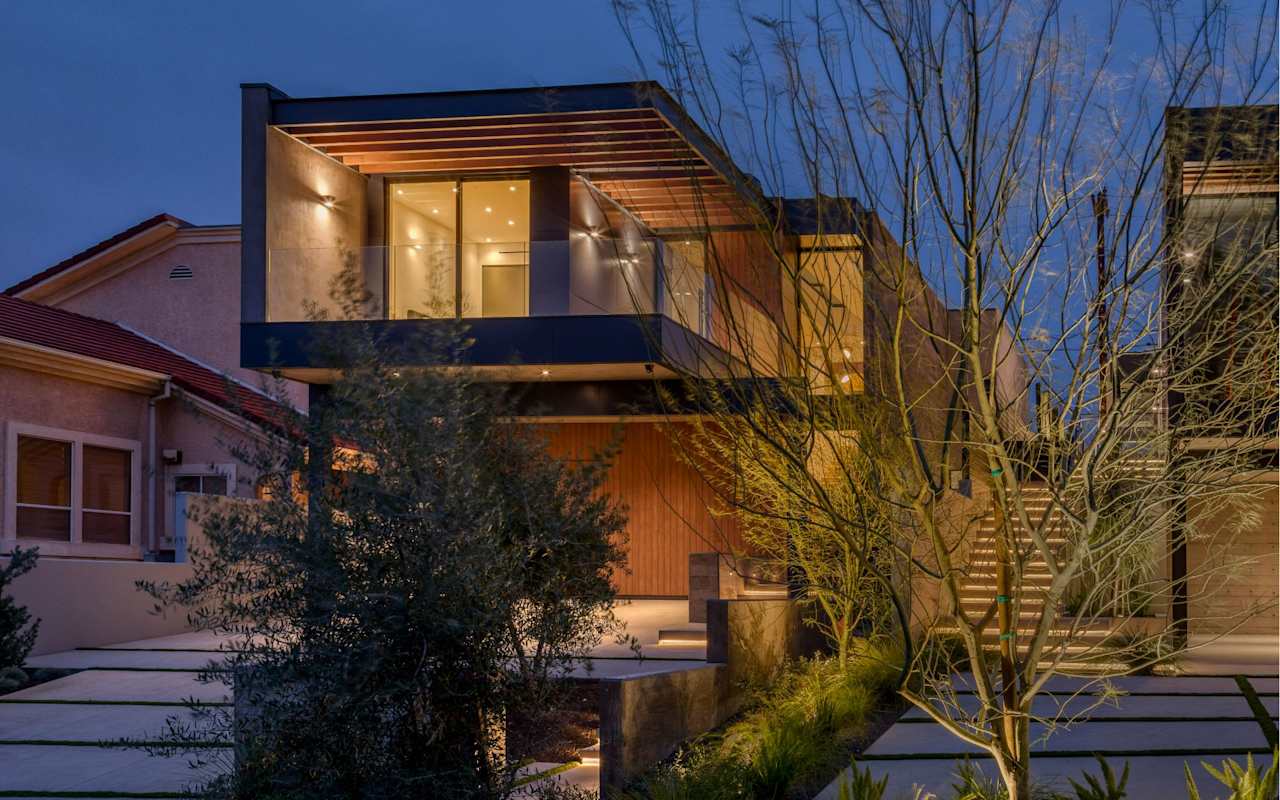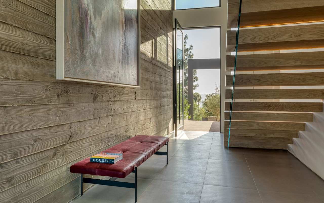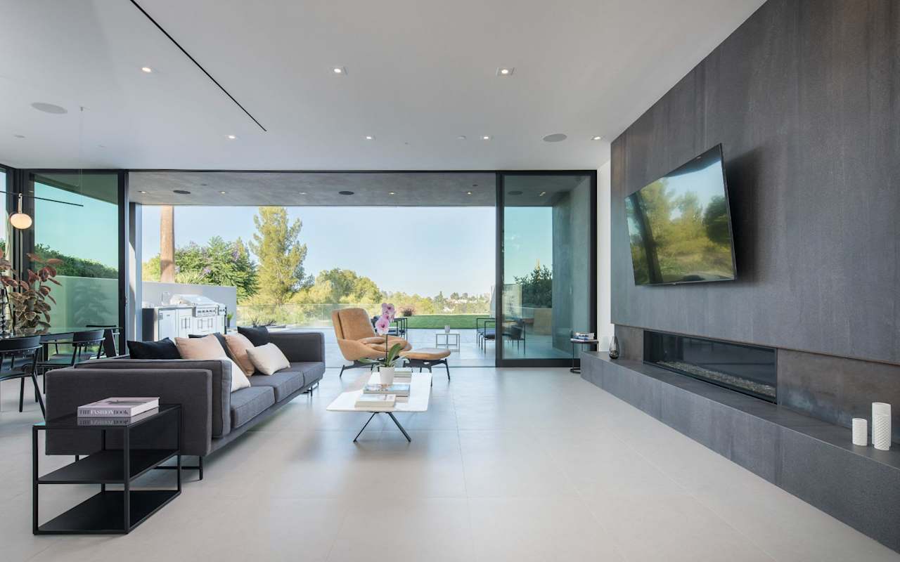 The 1746 Hanscom residence is a stunning modern home that draws inspiration from mid-century modern design, capturing the essence of contemporary elegance. As you approach the residence, you'll be greeted by a massive, cantilevered entry with a covered deck above, extending from the bedroom above. The entry is truly remarkable with a 10-foot glass pivot door that opens to reveal a striking two-story board-formed concrete wall, topped with a huge multi-panel skylight, filling the space with natural light. The living room space is centered around a large natural stone fireplace, creating a cozy and inviting atmosphere, perfect for relaxation and gatherings.