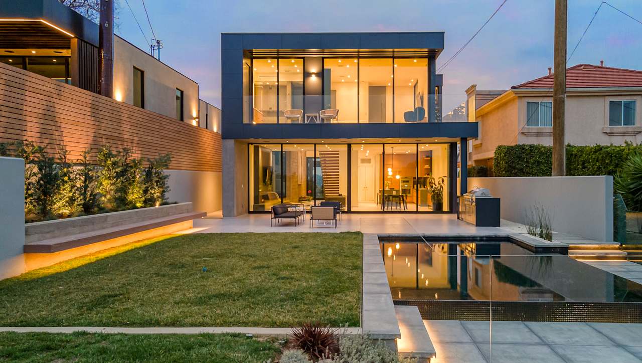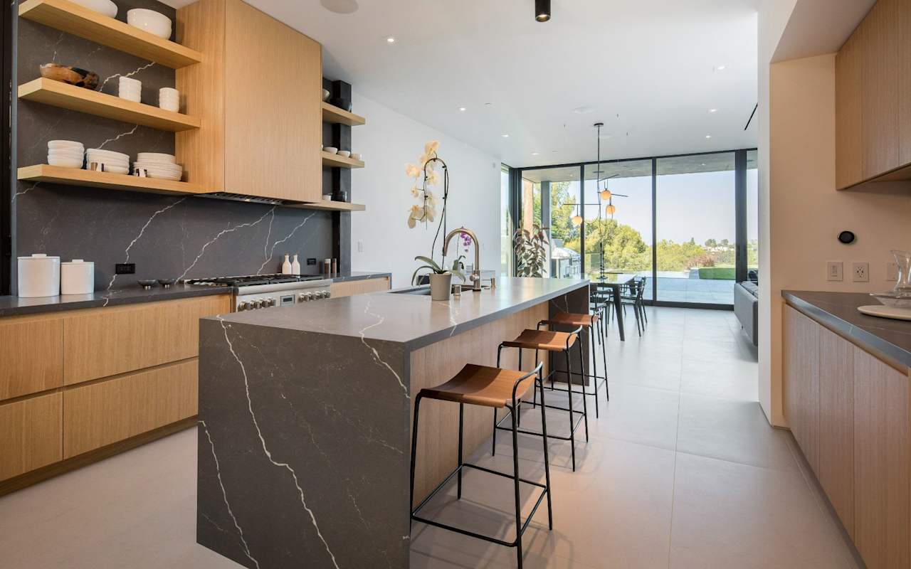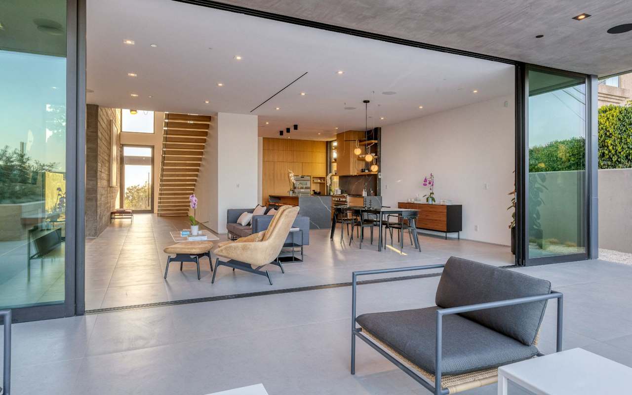 The kitchen is a culinary haven, featuring stone countertops, white oak millwork, and thoughtfully designed wine storage. Built-in energy-efficient appliances add a touch of modern convenience while ensuring sustainability. The dining room offers a unique experience, as massive floor-to-ceiling sliding glass doors open to a saltwater lap pool and lush grass, blending indoor and outdoor spaces seamlessly. The residence also includes a full outdoor kitchen and BBQ, making it an ideal setting for entertaining guests while enjoying the beautiful natural surroundings. A remarkable feature of the home is the floating wood stairs that transport you to the master bedroom wing, where a private covered patio deck awaits. The full bath with spa-like amenities adds a touch of luxury and indulgence to this exceptional residence, making it a true modern marvel.