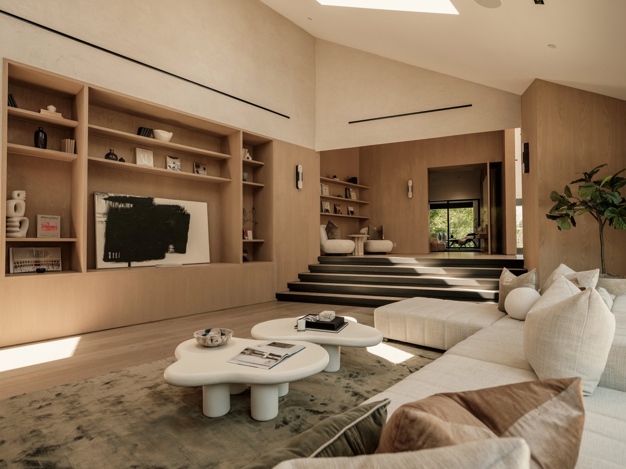 The 2555 La Mesa residence artfully reimagines mid-century design, drawing inspiration from the iconic Joseph Eichler style. Nestled within a tranquil oasis of privacy, the architecture of this home harmoniously integrates nature through its drought-tolerant landscaping and captivating zero-edge reflecting pool, reminiscent of the Getty Villa, which gracefully welcomes you into the private courtyard. At the heart of the property lies a monumental wrapping gabled skylight atrium, infusing the space with abundant natural light and a sense of grandeur upon entry.